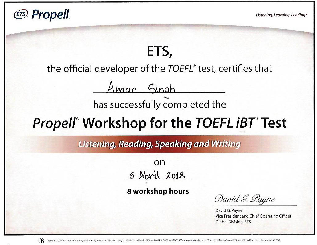 Prof. Amar Singh and his team of other Trainers have a vast experience in training students for TOEFL. They know how to make the students utilise their full potential. He has been able to make his students score up to 117/ 120 in TOEFL so far. If you want to personally meet Prof. Amar Singh, you may fix an appointment on mobile no.: 7208133997/ 9322103387(W).
